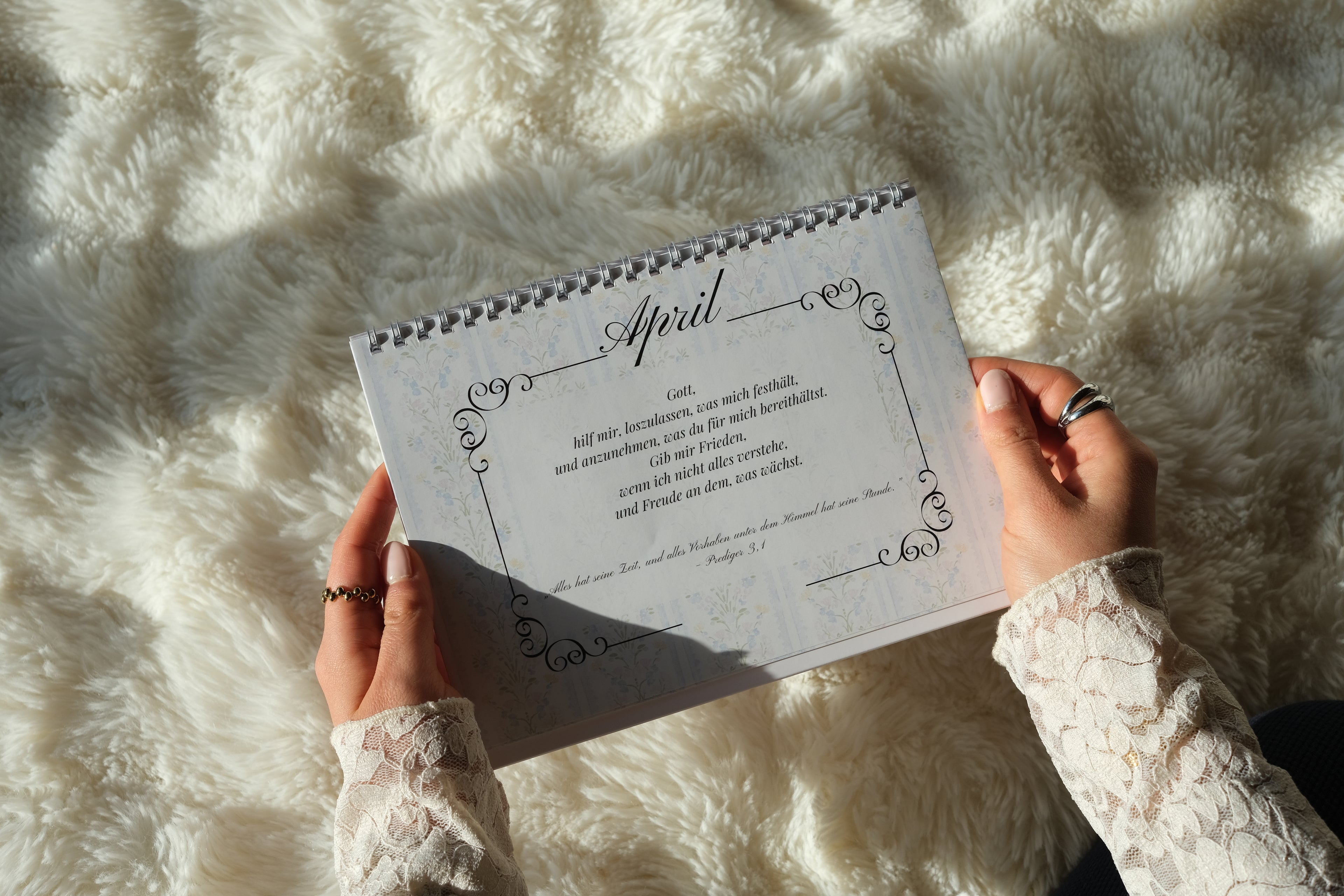 Wunderschöner christlicher, undatierter Tischkalender mit 12 schönen Monatsseiten, Versen & Gebeten.